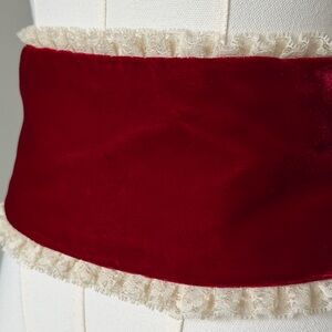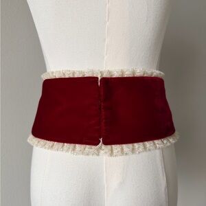 Bright red velvet corset belt with delicate cream-lace edging, a true vintage treasure.