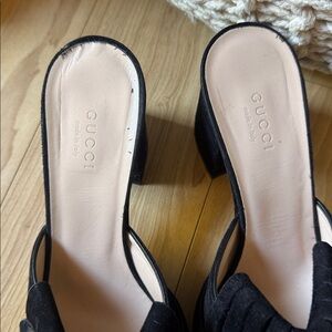 Chic black mules featuring iconic gold logo. Elegant and stylish design. These have normal wear and some flaws as they are worn