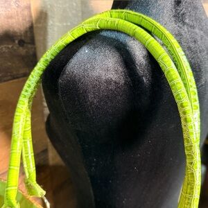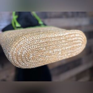Tan straw beach/swim tote with green handles and trim. Lightweight with green interior lining. One pocket inside with button snap closure. Measures 14.5"W x 12"L x 5"D. 10" strap drop. Cute for summer and in excellent like new condition.