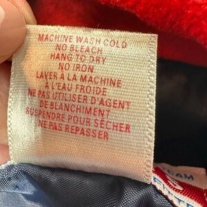 • Features: Beret style fleece cap in navy blue and red with white embroidery