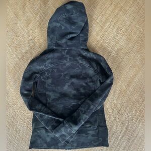 Size 6 lululemon fleece scuba hoodie in green and black incognito camo all over! Full zip with zipper garage, thumb holes and front pockets. Embroidered logo on the hood. Great condition.