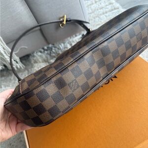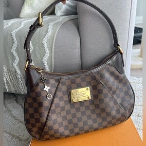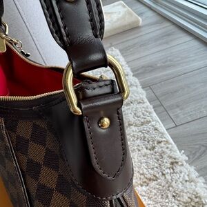 Authentic Louis Vuitton Thames GM in iconic Damier Ebene coated canvas with a beautiful red interior lining. A discontinued and highly sought-after Louis Vuitton style featuring the elegant front gold plaque and adjustable shoulder strap. 🎁 Bonus gift included: an unbranded LV-style charm (complimentary accessory). 📦 Comes with original Louis Vuitton box. 📏 Dimensions (GM): • Length: 40 cm / 15.7 in • Height: 26 cm / 10.2 in • Depth: 10 cm / 3.9 in • Strap drop: adjustable approx. 20–24 cm ✨ Condition: Excellent – 9.5/10 • Very good overall condition • No corner wear at all • Only light hairline scratches on hardware (as shown in video) • Spotless red interior • No smell at all (clean, smoke-free) Details: • Zip-top closure • Adjustable shoulder strap • Engraved gold-tone front plaque • Spacious interior with interior pockets for organization The GM size is perfect for everyday use — spacious yet refined. A timeless Louis Vuitton piece that continues to hold value beautifully. ✨ Open to reasonable offers from serious buyers (if outside) 📦 Fast, secure shipping 💬 Happy to answer any questions