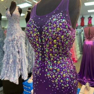 Party time purple dress with diving neckline and diamond detailed top. Also mesh top and back and metallic satin bottom closed with zipper in back.