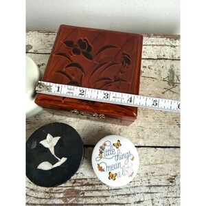 Curated collection of four vintage trinket boxes. The set includes a 1983 Hallmark Little Gallery bone china round box with a charming "Little things mean a lot" butterfly motif, a black stone or resin box featuring a delicate mother of pearl floral inlay, a celadon-glazed ceramic vessel with a minimalist matte finish, and a larger square lacquer-style box with a floral relief lid and a vibrant red fabric-lined interior.