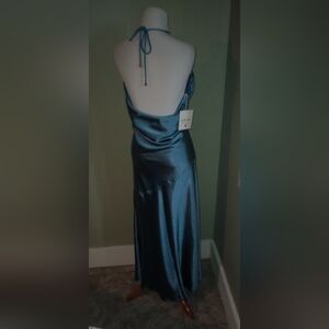 Sexy halter blue satin midi dress for wedding guest, homecoming dress, prom dress, elegant evening dress, date night, any night you want to shine. Made of polyester and spandex, ruched to fit your body. Sexy and silky, soft to the touch. Size XL. See size chart in picture for exact measurements.