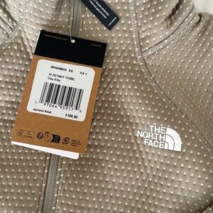 Stylish tan ski jacket by The North Face. Features a unique textured pattern. Perfect for snowy adventures.