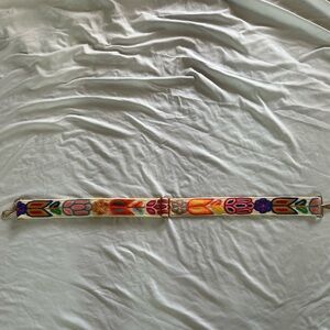 Vibrant embroidered belt with floral patterns. Features a mix of colors for a bold look. Perfect for adding a pop of color to any outfit.