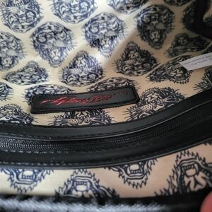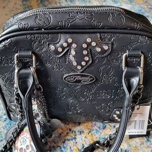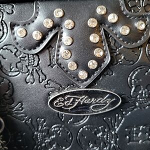Ed Hardy handbag with shoulder strap features skull-pattered design and rhinestone embellishments with vintage charms.