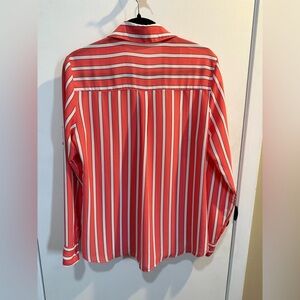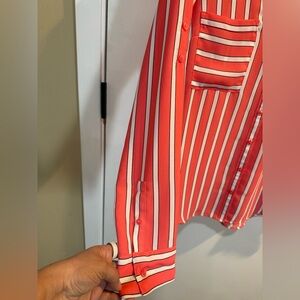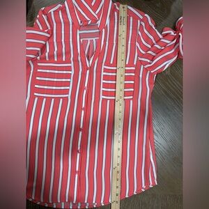 Chic button-down with bold stripes. Features a classic collar and front pockets. Ideal for versatile styling.