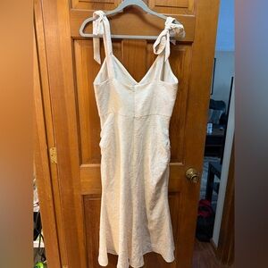 Elegant creamy white dress with textured fabric. The details include a V neckline, front fabric covered buttons, rushing on sides at hips with front kick slit. The straps tie at the shoulders and are therefore adjustable. It’s lined to about the hips and zipper closure in the back. Bought for daughter’s wedding rehearsal dinner but she went another route so it’s new with tags. Pretty enough for wedding, bridal shower or rehearsal. Perfect for any occasion.