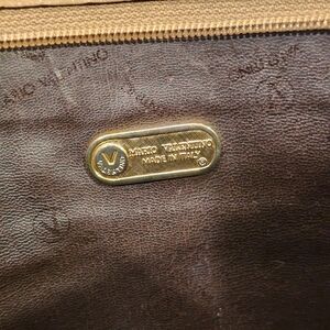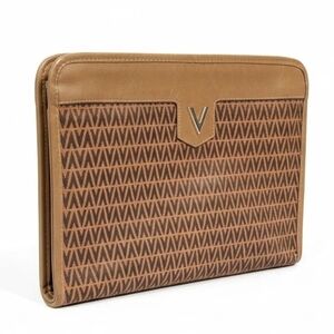 Vintage Mario Valentino clutch bag features the brand's iconic "V" logo on a leather plate and a distinctive monogram pattern.