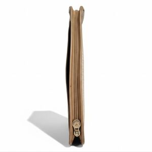 Iconic "V" monogram pattern, gold-tone hardware, and a zippered closure.
