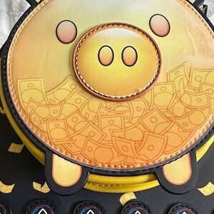 Unique Loungefly backpack with Squid Game theme. Features piggy design and vibrant colors.