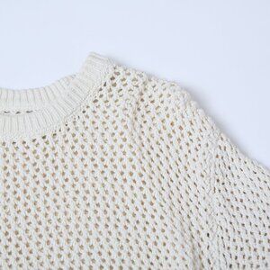 Aritzia TNA Ponderosa is a crew-neck, mesh-knit t-shirt with a ribbed neckline. It's made with soft cotton yarn (96% cotton, 4% polyester). In color "birch" women's size XS. Has an relaxed, oversized fit. Preloved in great condition. Has some pulling on the left shoulder from hanging on a hanger. Fabric tag is removed (information taken from Aritzia website.
