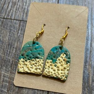 Stylish green and gold dangle earrings. Perfect for any occasion. Handmade. Love the colors. Smoke free home