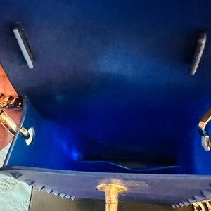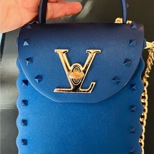 Chic fashion mini bag in royal blue. Features gold hardware and studded details. Ideal for a stylish touch. Chain can be removed for a lil tote. Front turnlock slightly tarnished vibing an antique look.