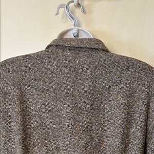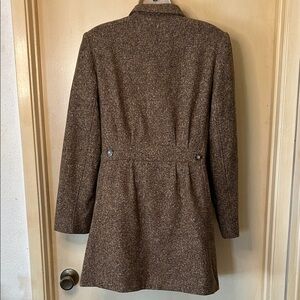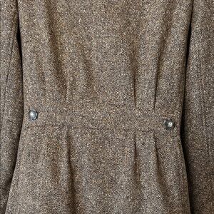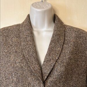 Discover timeless elegance with this classic tweed brown wool/silk blazer. It’s a long line blazer, fully lined with faux belt in back. Perfect for any occasion, it offers a blend of style and comfort. Excellent vintage condition