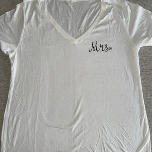 White short sleeve tee. V-neck style. 'Mrs' script on chest.