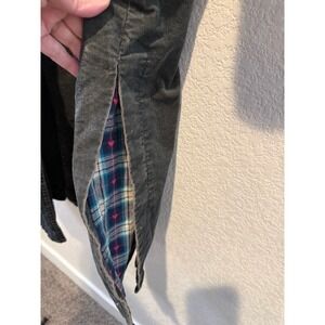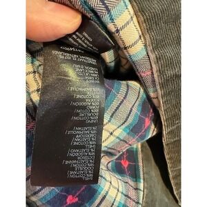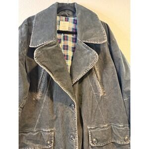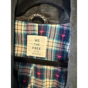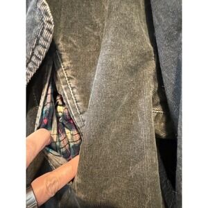 Free People We The Free corduroy trench coat features a faded black or dark charcoal wash with a distinctive oversized silhouette. Crafted from a comfortable stretch cotton blend, this longline jacket is lined with a charming plaid flannel fabric accented by small pink hearts. Design details include a wide notched lapel, button-front closure, large utility-style front pockets, and side slits that reveal the colorful interior lining. The back is finished with a yoke detail and central seam for a structured yet relaxed bohemian look.