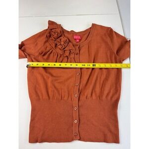 Keywords: ELLE cardigan, womens sweater, rosette cardigan, knit cardigan, orange sweater, button down cardigan, xs cardigan, parisian style, chic cardigan, floral applique, ribbed cardigan, casual cardigan, dressy cardigan, sweater with flower