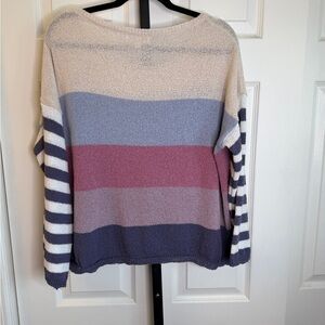 Lightweight oversized knit sweater with bold stripes from Listicle, size medium. Great condition. Features cream, pink, blue, and navy colors. Long sleeves with striped pattern. Perfect for casual outings.