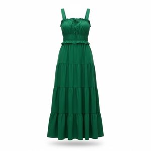 Step out in style with this elegant green maxi dress. Beautifully tiered. Lined bodice. adjustable neckline. Perfect for any occasion, this dress offers a flattering fit and a vibrant color that stands out.