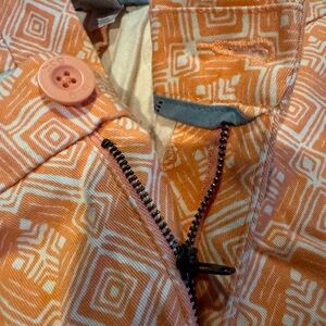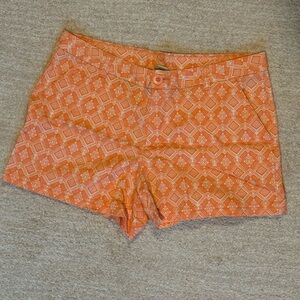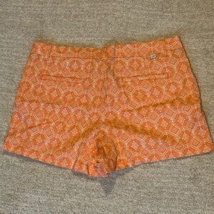 BCG brand orange/ coral colored geometric print shorts in size 12. Structured woven fabric similar to jeans with minimal stretch. Metal zip and button closure with extra button included in case of a needed repair. Functional front and back pockets as pictured. Lightweight but not flimsy fabric with a clean tailored look.