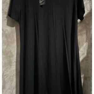 This Molerani women's versatile black T-shirt dress featuring short sleeves and a loose fit, suitable for casual or semi-formal wear. Classic round neckline and a loose, flowy "swing" silhouette.