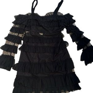Chic black mini dress with lace detailing. Off-shoulder design with layered sleeves. Perfect for a night out.