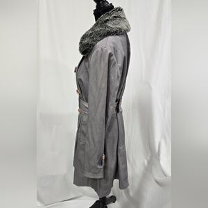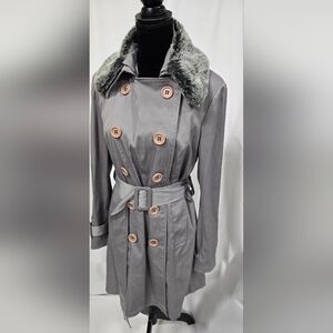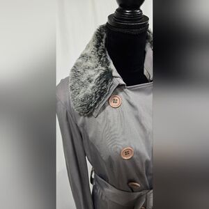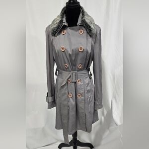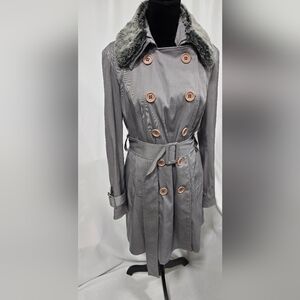INC L belted trench coat jacket double breasted faux fur collar gorpcore grunge, gray button removable faux fur collar, polyester cotton blend