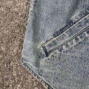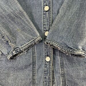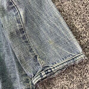 Pre-owned denim jacket. Has staining, fading, and fabric wear.