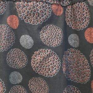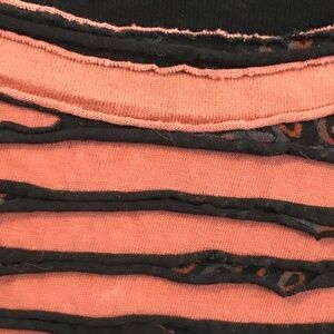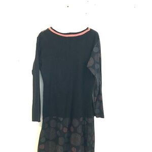 Leopards & Roses dress in women's size medium. Art to wear with florals and crochet in pink, blue, rust and black. Dress is knee length, has stretch and has a crew neck line with a raw rolled hem. One are is solid black, other arm has florals. Bohemian, festival, weekend styling.