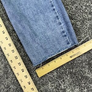 Pre-owned jeans with light general wash wear and softening from prior use and laundering. Raw-cut leg openings show frayed edges consistent with the unfinished hem design. Has a small fabric wear spot and a small spot.
