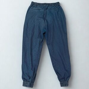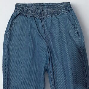Sweaty Betty London lightweight jogger pants in a blue pinstripe pattern. Features an elastic waistband with drawstring, side pockets, back welt pockets, and elastic cuffs at the ankles. Relaxed, tapered jogger fit that works well for athleisure, casual wear, or travel. EUC - no flaws.
