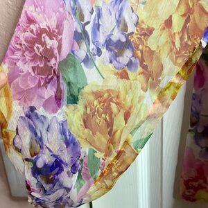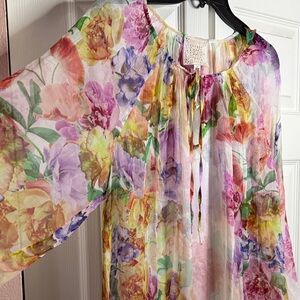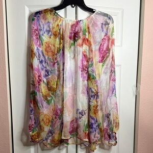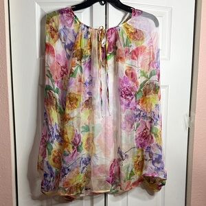 Beautiful Johnny Was silk chiffon tunic in size 1X. Features a romantic watercolor floral print with signature embroidered neckline detail and tassel tie front. Lightweight and flowy with sheer 100% silk fabrication.