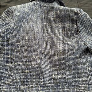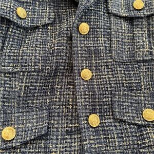 Elegant navy tweed jacket with metallic details. Ideal for sophisticated style.