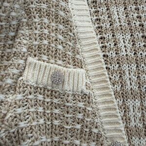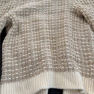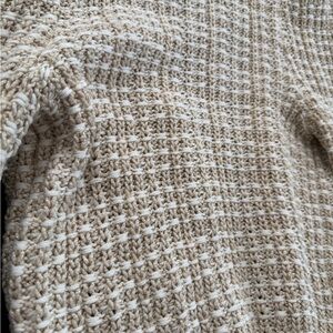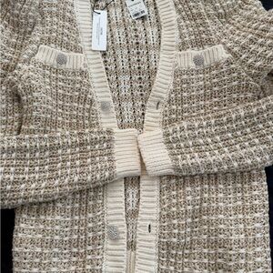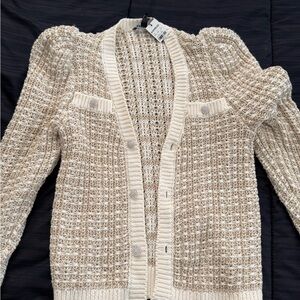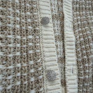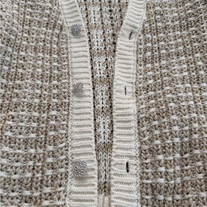 Chic cream cardigan with textured knit. Features button-down front and stylish design. Ideal for layering.