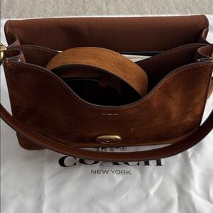 Elegant brown suede shoulder bag with gold-tone hardware. Perfect for any occasion.