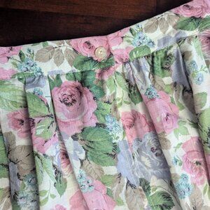 Pastel pink, blue, and green floral a-line midi skirt in women's size 12 (seems to be an older piece with minimal stretch, please double check measurements below). Button and zip closure in front. The perfect skirt for spring and summer made out of a lightweight, flowy material in the USA.