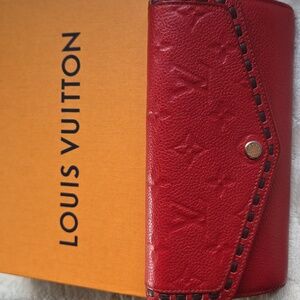 Chic red wallet with iconic monogram. Features a secure button closure.