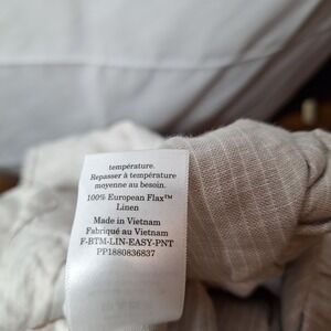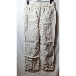 The EVERLANE Linen Easy Pant in size L is a versatile and stylish pair of pants perfect for various occasions such as travel, casual outings, and workwear. Made from 100% European Flax Linen, these pull-on pants feature a comfortable elastic waist and a relaxed fit. With a classic beige and white striped pattern, these ankle-length pants are easy to care for, lightweight, and wrinkle-resistant. The wide-leg design and high-rise waist make them a flattering and trendy choice for a minimalist, preppy, or summer-inspired wardrobe.