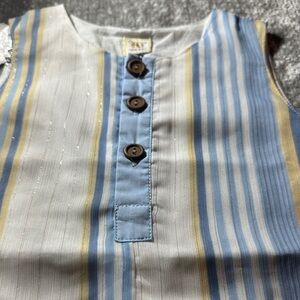 Adorable sleeveless baby romper with blue and yellow stripes. Features button details on the front.