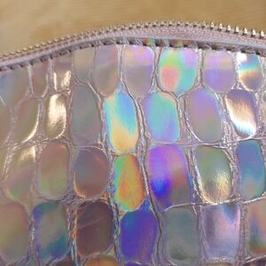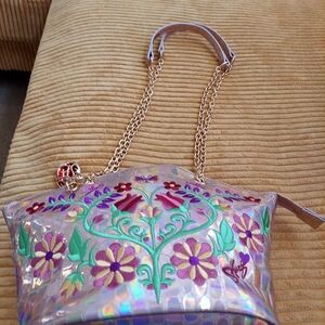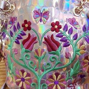 This stunning holographic bag features vibrant floral embroidery, perfect for adding a pop of color to any outfit. The unique design is both stylish and functional, making it a must-have accessory. Made of 100% genuine leather. Lavender.