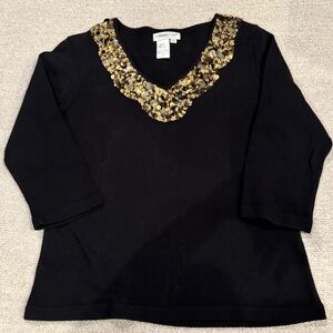 Coldwater Creek black knit top featuring a gold sequin embellished neckline. Made of 100% cotton for soft, breathable comfort. 3/4 sleeves and flattering silhouette.