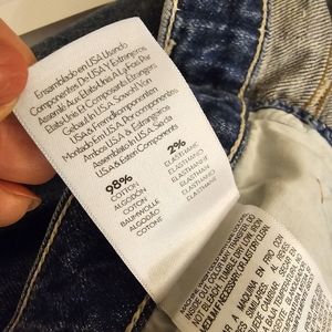 Features: mid wash blue, high rise, distess, button fly closure, pockets, straight leg, crop, 98%cotton 2%elastane stretch