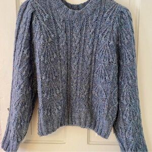 Stay cozy and stylish with this blue cable knit sweater. Perfect for any occasion.