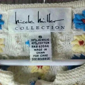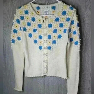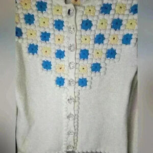 Nicole Miller embroidered cardigan size small cream with blue and yellow flowers.