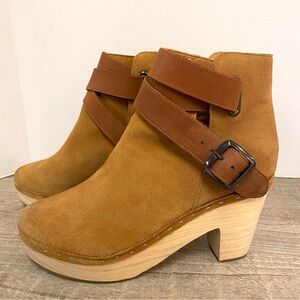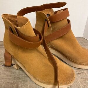 Free People Bungalow Clog Boot Tan Suede Leather Ankle Buckle Strap 38 US 7.5/8