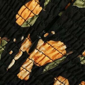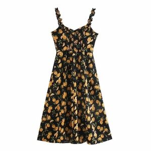 This lemon print midi slip dress combines style and comfort with a ruched elastic back panel, elasticized straps, and a zipper closure for a secure, flattering fit.