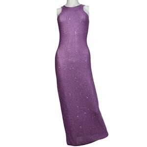 Purple sleeveless midi dress with allover sequins and a fitted silhouette. This garment features features a round neckline and stretch knit construction in 100% polyester.